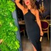 With this hottie in your rotation, you’ll never want to stay in again! This stunning floral midi dress is sure to make those good times bloom with a flirty floral print, plunging neckline, and bodycon fit to show off those curves! Sleek shoulder pads and a ruched detail add a touch of drama, and the sassy front split is the perfect finishing touch. Make sure you’re the pick of the bunch with pretty pink accessories and gold floral earrings – now that’s flower power!
