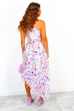 If you stay classy you aint gotta get classy, Doll! Turn heads and put the petal to the medal in this stunning floral one-shoulder satin dress. In the perfect midi length, featuring a white and purple flower pattern, asymmetrical flowing hemline and pleated design, it’s the perfect mix of class and sass. Dress like a daydream for your next big event in white block heels and all the gold accessories. Bloomin’ beautiful!