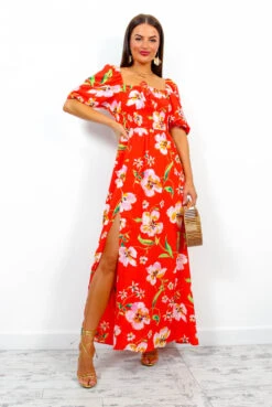 An utterly timeless addition to your wardrobe. One of our most iconic maxi dresses now comes in a baby pink chiffon fabric with a red abstract print, and we are totally loving it. Featuring that show stopping cut-out back, floaty over-laying sleeves, and that pleated bottom. In all red accessories and a matching lip, you’re set to go for your next big event.Â