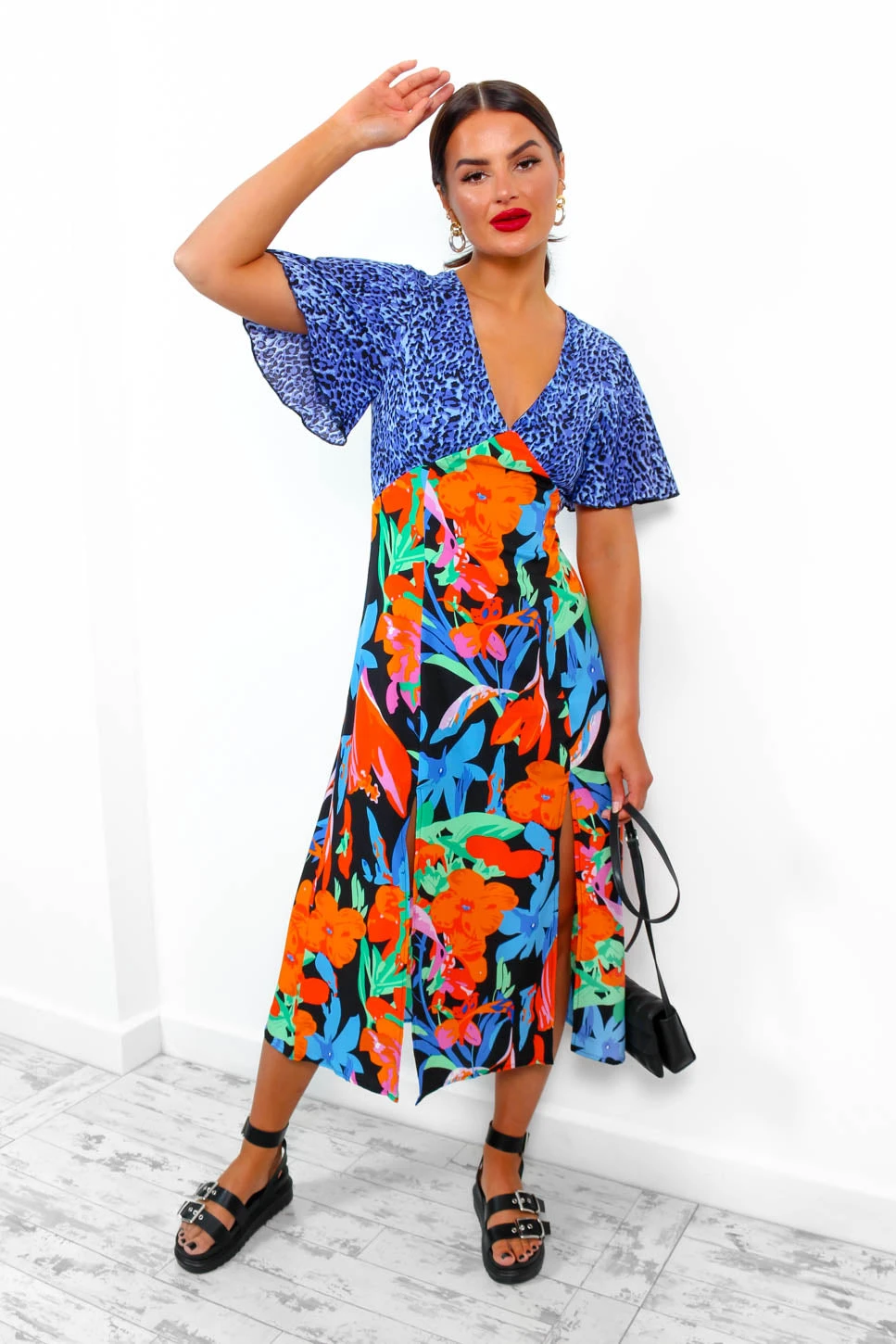 Having a budding romance over this midi dress. Featuring a mix of animal print and floral print in stunning blue and orange tones, short floaty sleeves, a v-neckline, and a double leg split. Take it on your hols in cute sandals or dress it up for those special occasions in heels and a coral lip.Â