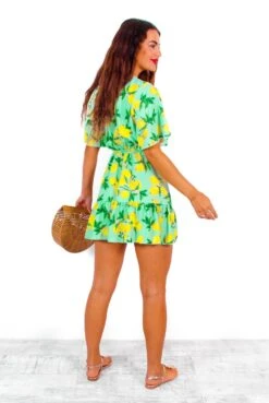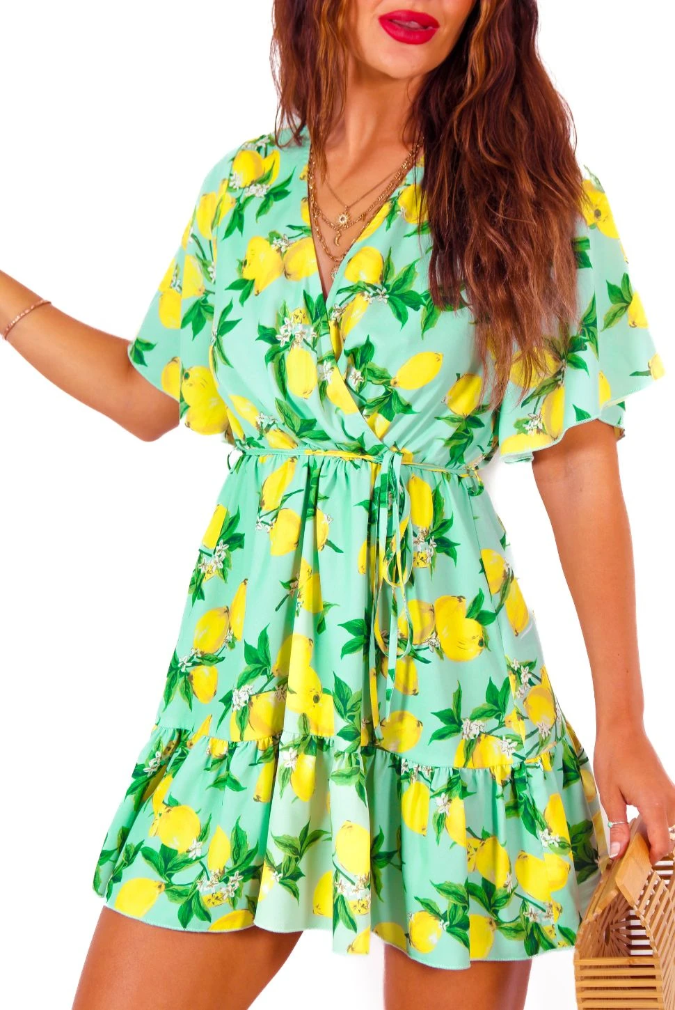 When life gives you lemons… make a lemon cocktail! Get your holiday rotation ready for take-off in this stunning lemon print mini dress. This sassy tiered hem mini is the answer to your Mediterranean dressing dreams – with a cool green and zesty lemon print, a matching material belt to cinch the waist and a crossover neckline. You look like a total hottie, Doll! Layer up on the gold jewellery and slip on a pair of gold platform mules for a holiday look that can take you from day time soirees to evening dinner and drinks.Â
