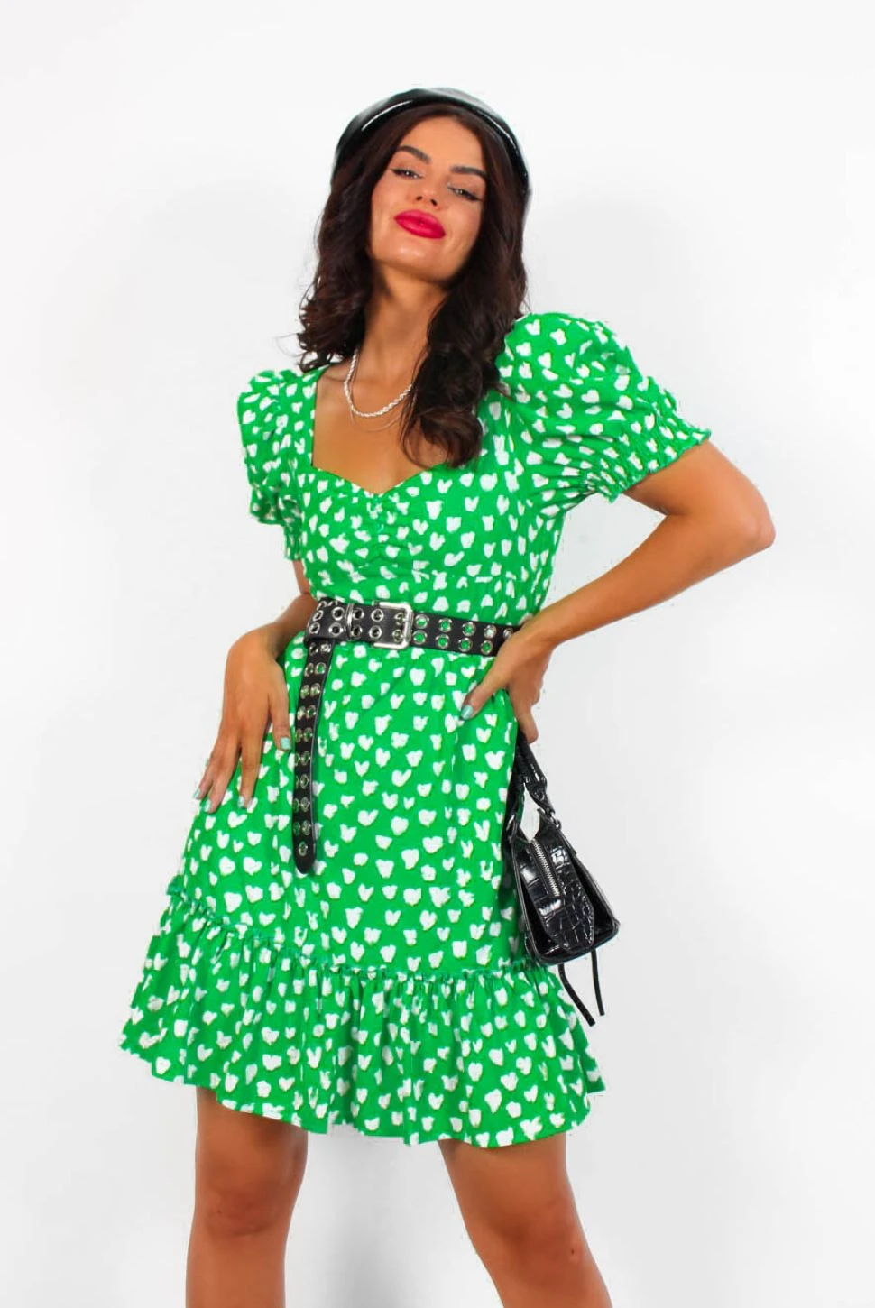 She’s sweet… but watch her wild side. Blooming with a bold green and white love heart pattern, this romantic heart print mini dress features puff sleeves, a sweetheart neckline and a ruffled hemline detail. Keep it cute in a statement stiletto boot for casual outings, or add killer heels for brunch with the Dolls.