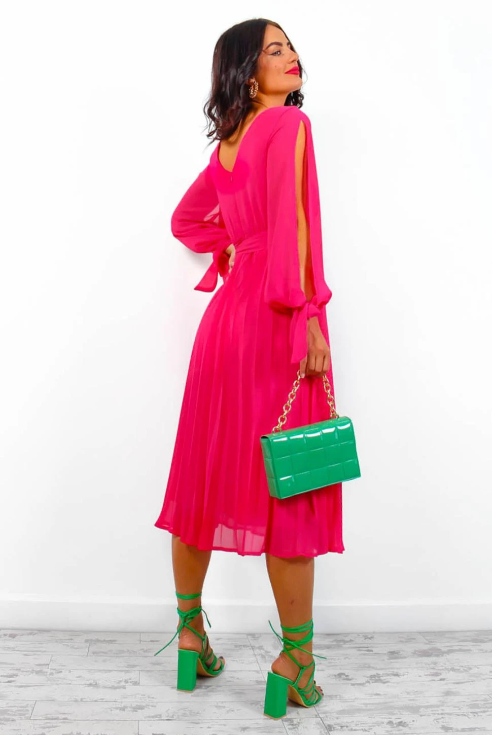 This dress is always on our minds. This midi dress comes in a bright fuchsia, round neck, long sleeve with tied cuffs, a pleated skirt, peekaboo shoulder slits and a removable belt. Ready to make everyone wink this occasion season, add gold heels and accessories for the wow factor.Â
